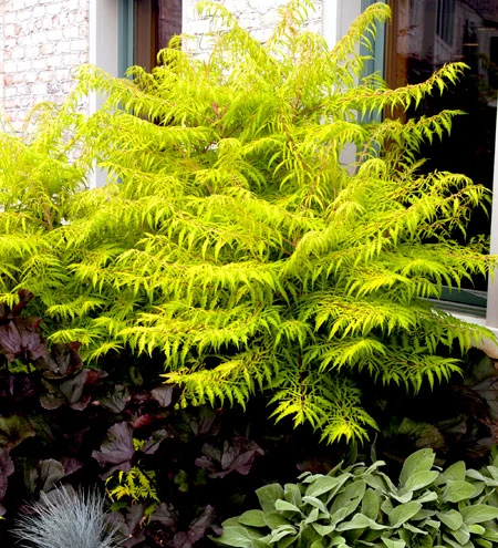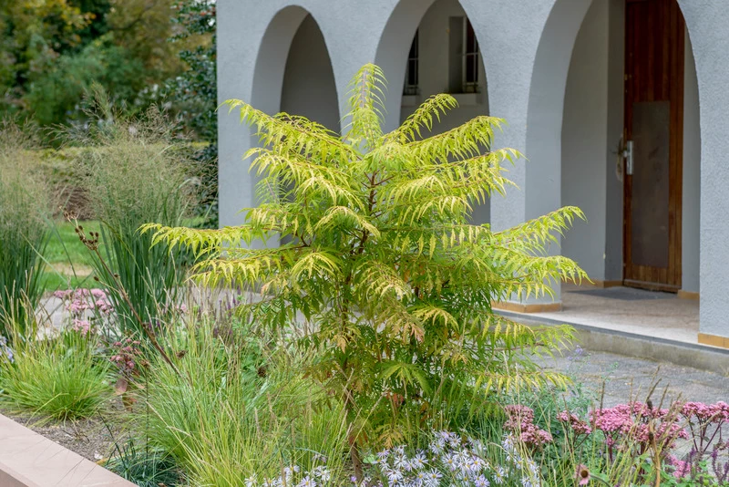 Der Essigbaum stammt ursprünglich aus Nordamerika, wurde aber bereits vor 300 Jahren nach Europa importiert und wird seitdem als Ziergehölz angepflanzt. Der mehrtriebige Strauch entwickelt eine malerische Form und bildet bis zu 35cm lange, gefiederte Blätter mit gold-gelber bis gelb-grüner Ausfärbung aus. Diese färben sich im Herbst eindrucksvoll in orangenen bis scharlachroten Farbtönen und machen den Zierstrauch im September und Oktober zu einem absoluten Hingucker. Die Blätter der Sorte Tiger Eyes sind zudem stark eingebuchtet, was an die Form von Farnen erinnert. Im Sommer bildet der Essigbaum winzige, braunrote Blüten aus, welche an einer Rispe am Triebende stehen. Daraus entstehen die kleinen roten Steinfrüchte, welche zwar einen schönen Zierwert haben, jedoch nicht essbar sind.